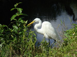 Dans cette eau somnolente, pullulent, dans leur glissement silencieux, des milliers de poissons. Parfois, affleurant à la surface et avançant sans même faire une vague, un alligator se laisse porter par un courant invisible. Le plus souvent, le saurien fait le mort au soleil. Des tortues paraissent mises en arrêt par quelque cataclysme dans leur position stationnaire. Sur les bords des étangs, les hérons, les aigrettes, les courlans, aux aguets, avancent avec lenteur et solennité, l’œil fixe, en levant haut leurs longues pattes.