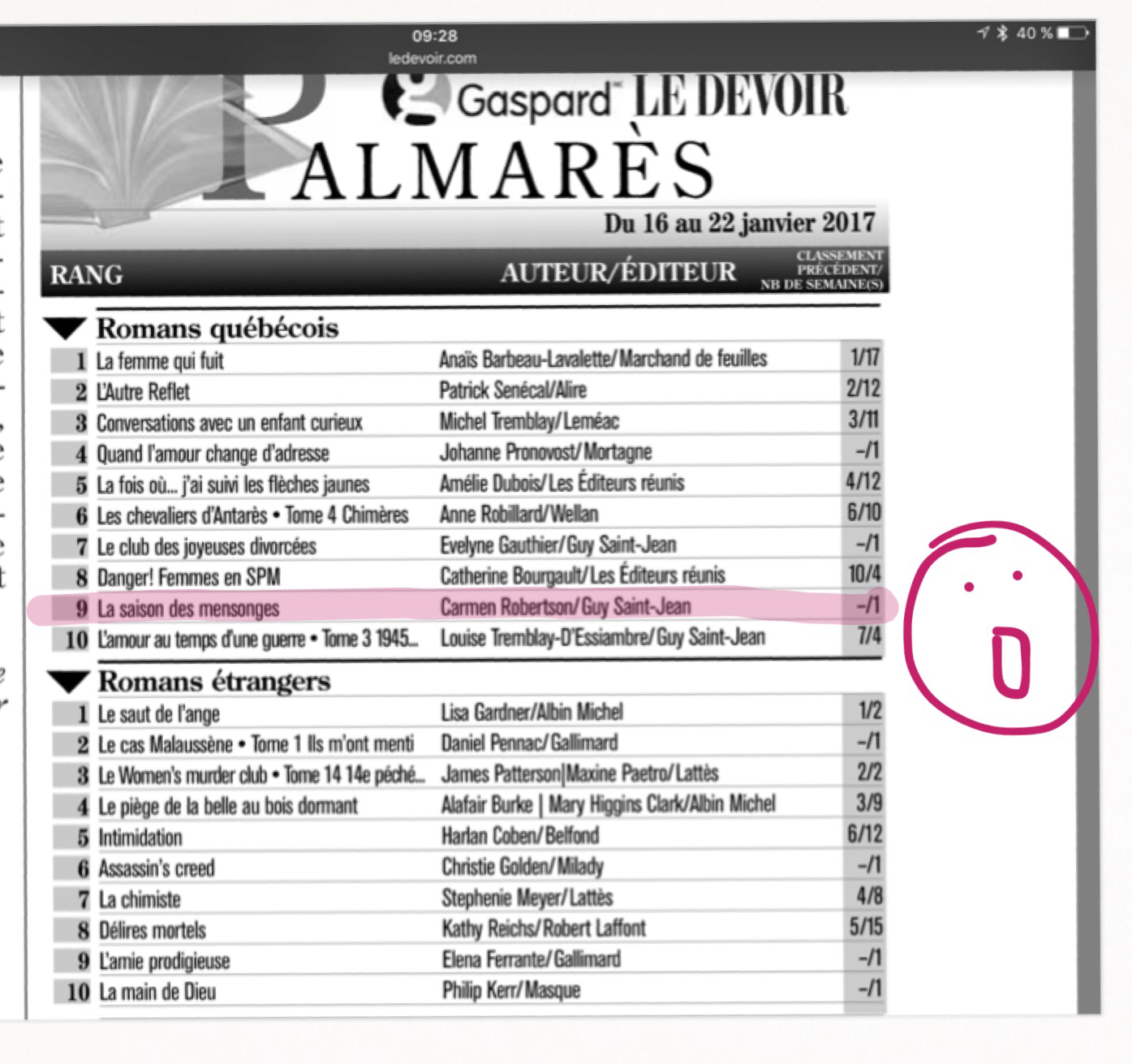 Oui, j’en suis bouche bée. Je n’avais jamais cru voir ça un jour. La Saison des mensonges se retrouve dans le Palmarès des meilleures ventes de livre pour la semaine du 16 au 22 janvier. Bien sûr, l’étonnement n’empêche pas le plaisir.