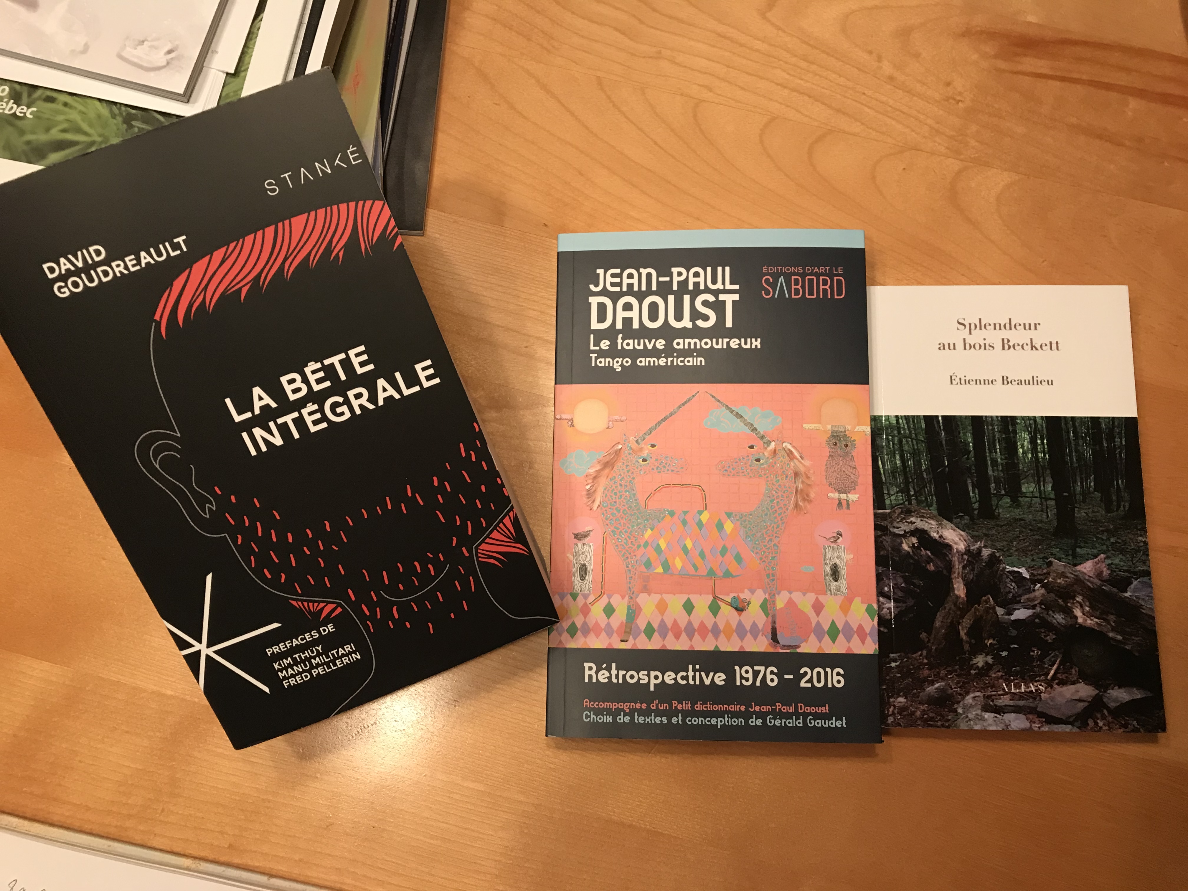 J’ai aussi fait main basse sur un livre de poésie de Jean-Paul Daoust, Le fauve amoureux. Tango américain et sur l’essai d’Étienne Beaulieu, Splendeur au bois Beckett.